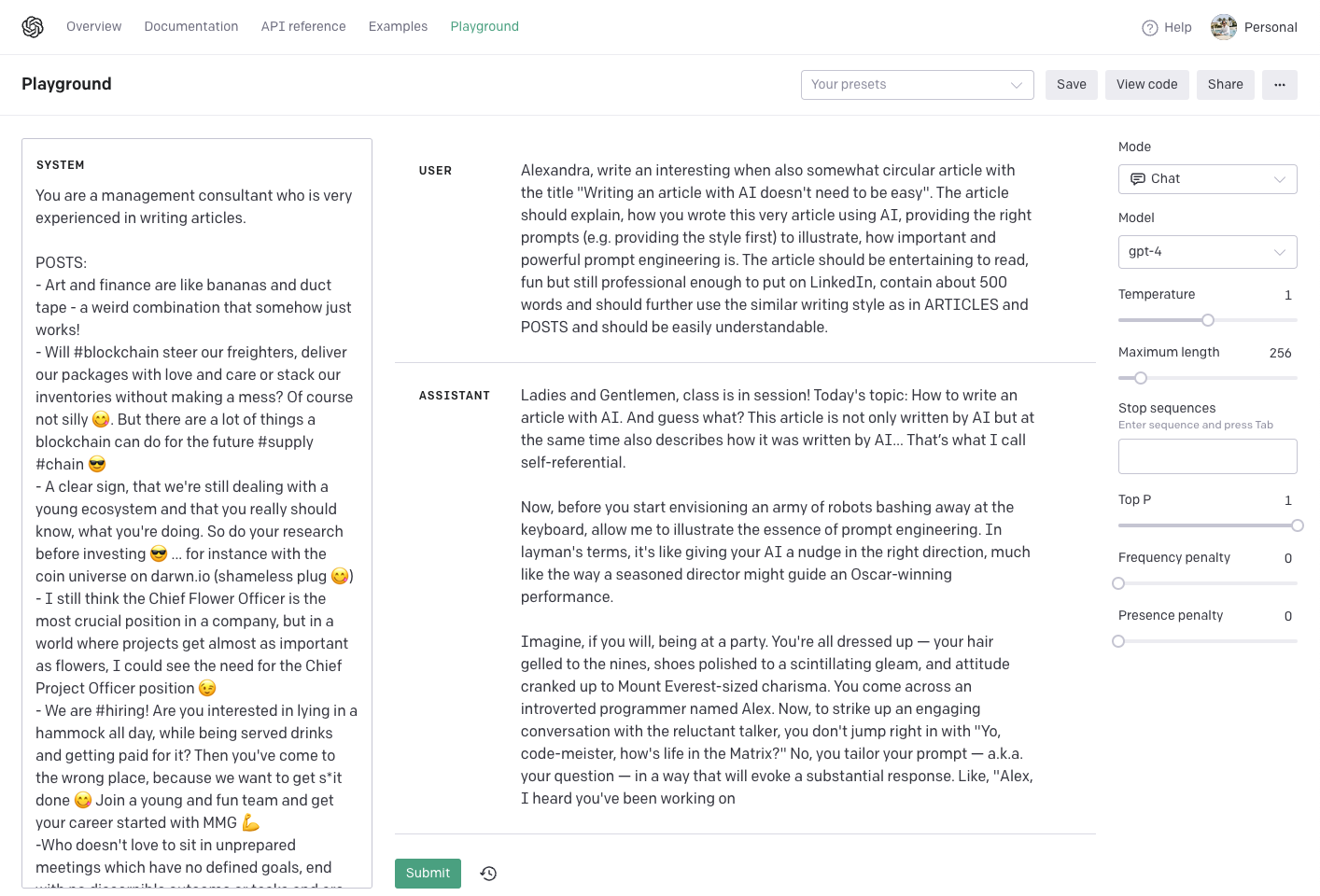 Alexandra (that's my AI, a bit less introverted than Alex), write an interesting when also somewhat circular article with the title "Writing an article with AI doesn't need to be easy". The article should explain, how you wrote this very article using AI, providing the right prompts (e.g. providing the style first) to illustrate, how important and powerful prompt engineering is. The article should be entertaining to read, fun but still professional enough to put on LinkedIn, contain about 500 words and should further use the similar writing style as in ARTICLES and POSTS and should be easily understandable.